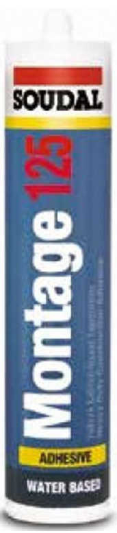 Soudal Montage Adhesive 125, çok yüksek ilk tutunma değerine sahip (125kg/m2) genel amaçlı bir yapıştırıcıdır. Ağır malzemelerde bile vida, çivi, dübel kullanma gereksinimini ortadan kaldırır.